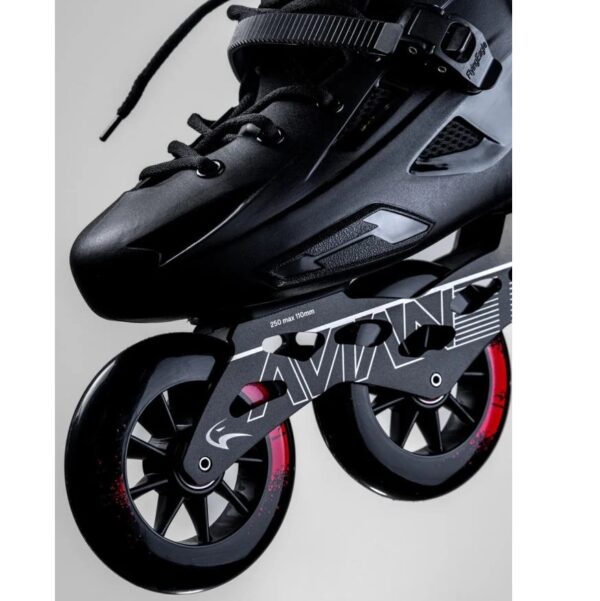 این اسکیت مناسب برای ورزشکاران مبتدی تا نیمه حرفهای است و وجود سوراخهای متعدد روی بدنه اسکیت برای جریان داشتن هوای بهتر و تنفس پا است. تیغه این اسکیت قابلیت راکر بودن و تغییر دلخواه چرخهای ابتدا و انتهایی فریم به اندازه 4 میلیمتر را دارد و جنس تیغه یا فریم از آلیاژ الومینیوم موسوم به CNC کربن تهیه شده است. سیستم فریم یا تیغه این اسکیت قابلیت جداسازی دارد و به راحتی میتوانید آن را جدا کنید و یک تیغه جدید روی اسکیت سوار کنید. چرخهای این اسکیت با قطر 110 میلیمتر استفاده شده است. جنس بلبرینگ استفاده شده در این نوع از نوع ABEC 7 میباشد و از فلز کروم ساخته شده است که یک انتخاب عالی برای الیاژ مورد استفاده در این اسکیت است و مقاومت بالایی دارد.