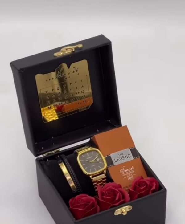 جعبه صنوقچه ای تقویم روز دلخواه ساعت کاسیو اولد مانی درجه یک دستبند دولاین چرمی ادکلن لبخند اسمارت رز معطر