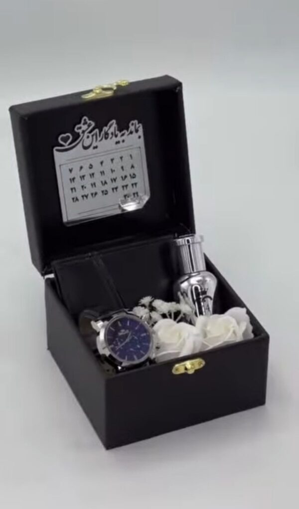 باکس صندوقچه ای و تقویم کیف پول جیبی ادکلن 40 میل ساعت بند چرمی تاریخ دار درجه یک رز معطر